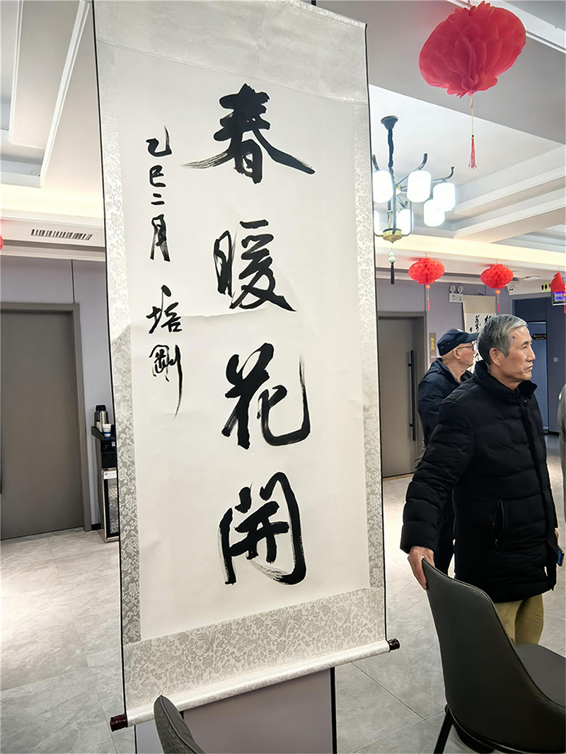 史培刚老师以自己多年的书法创作和教学经验为基础,结合自己写作的《书法鉴赏与品评》为切入点,首先史老师围绕书法品评基本方法:一是阅其文,二是观其形,品其味,四是察其功,五是溯其源。接着史老师从历代经典作品赏析方面,用PPT展示了:楷书作品有唐代颜真卿《颜家庙碑》、唐代柳公权《神策军碑》、唐代褚遂良《大字阴符经》、唐代欧阳询《九成宫醴泉铭》、北魏《张猛龙碑》、北魏《李璧墓志》、《龙门二十品》、小楷,汉代钟繇《宣示表》、东晋王羲之《乐毅论》、宋代赵孟頫《汲黯传》;行书作品有东晋王羲之《兰亭集序》、唐代颜真卿《祭侄文稿》、宋代苏轼《寒食帖》;草书作品有汉代皇象《急就章》、唐代孙过庭《书谱》、唐代张旭《古诗四首》。史老师深入浅出的解说,亲切风趣的风格,赢得了热烈掌声。史老师强调了书法作为中国传统文化的重要组成部分,其精神内涵不容忽视,同时,史老师还鼓励大家要多动手实践,将理论知识与实践相结合,才能真正掌握书法的精髓。最后,史老师现场挥毫泼墨,创作了作品《春暖花开》,既为观众演示了书法的运笔技巧和构图要领,又为中国国际书画院送来了满满祝福,又赢得了阵阵热烈掌声。